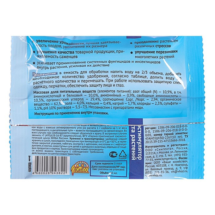 Массовая доля питательных веществ (элементов питания): азот общий (N) — 10,9%, в т.ч. аминокислотный и белковый — 10,0%, аммонийный — 0,9%, свободные аминокислоты — 10,3%, органический углерод — 29,4%, соотношение Сорг. /Nорг. — 2,94, органическое вещество — 62,5%, зола — 4,0%, кальций — 0,4%, натрий — 1,7%, хлориды — 2,3%, сульфаты — 1,1%, рН 10% раствора — 5,5–7,5.