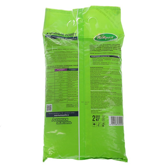 Произведен по современным технологиям, которые обеспечивают важные преимущества перед обычным компостом - удобрение не имеет резкого запаха. В процессе биотехнической обработки куриного помета Добрая Сила уничтожаются патогенные болезни (сальмонелла, грибковые заболевания, вплоть до куриного гриппа), яйца гельминтов, личинки насекомых-вредителей, семена сорных растений. При длительном хранении удобрение не меняет своих свойств.