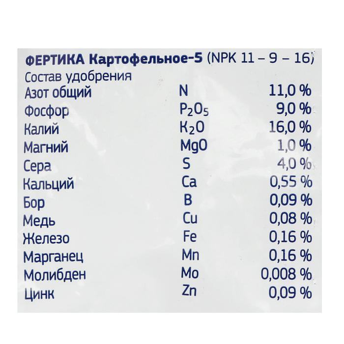 Fertika «Картофельное-5» — это комплексное гранулированное удобрение. Состав и соотношение питательных элементов подобраны с учётом биологических особенностей культуры.