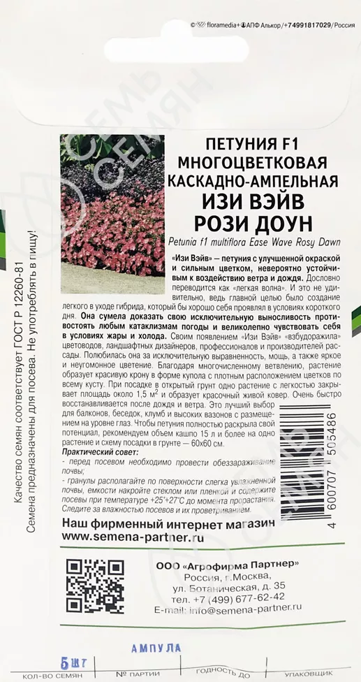 «Изи Вэйв» - однолетняя петуния с улучшенной окраской и сильным цветком, невероятно устойчивым к воздействию ветра и дождя. Дословно переводится как «легкая волна». И это не удивительно, ведь главной целью было создание легкого в уходе гибрида, который бы хорошо себя проявлял в условиях короткого дня. Благодаря многочисленному ветвлению, растение образует красивую крону в форме купола с плотным расположением цветков по всему кусту. При посадке в открытый грунт одно растение с легкостью закрывает площадь около 1,5м² и образует красочный живой ковер. Очень быстро восстанавливается после дождя и ветра. Это лучший выбор для балконов, беседок, клумб и высоких вазонов с размещением на уровне глаз.