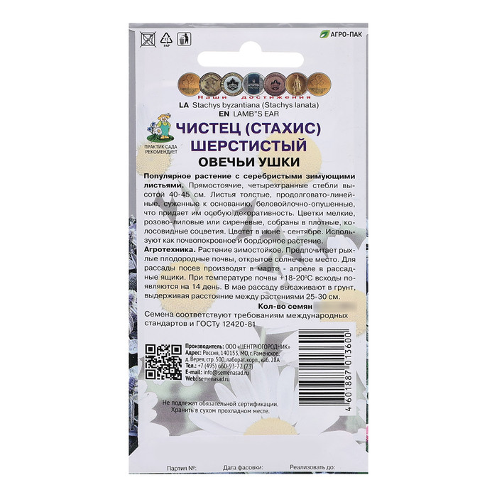 Популярное растение с серебристыми зимующими листьями. Прямостоячие, четырехгранные стебли высотой 40-45 см. Листья толстые, продолговато-линейные, суженные к основанию, беловойлочно-опушенные, что придает им особую декоративность. Цветки мелкие, розово-лиловые или сиреневые, собраны в плотные, колосовидные соцветия. Цветет в июне-сентябре. Используют как почвопокровное и бордюрное растение.Агротехника. Растение зимостойкое. Предпочитает рыхлые плодородные почвы, открытое солнечное место. Для рассады посев производят в марте-апреле в рассадные ящики. При температуре +18-20°C всходы появляются на 14 день. В мае рассаду высаживают в грунт, выдерживая расстояние между растениями 25-30 см.Семена соответствуют требованиям международных стандартов и ГОСТу РФ 12420-81