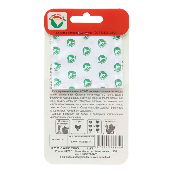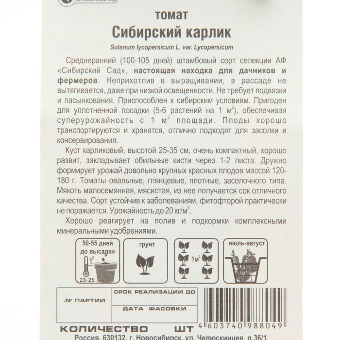 Особенности выращивания: Сейте на рассаду в марте-апреле. «Сибирский карлик» не требует пасынкования и формировки. Отличный выбор для занятых огородников!