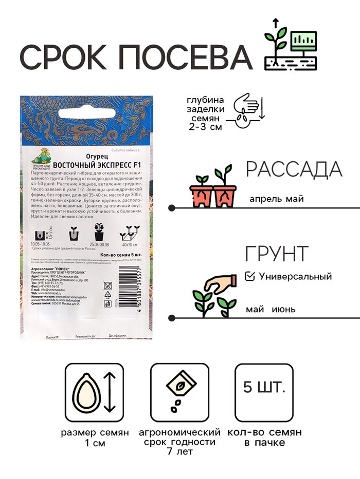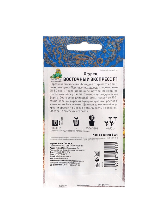 Партенокарпический гибрид для открытого и защищенного грунта. Период от всходов до плодоношения 45-50 дней. Растение мощное, ветвление среднее. Число завязей в узле 1-2. Зеленцы цилиндрической формы, без горечи, длиной 35-40 см, массой до 300 г, темно-зеленой окраски, бугорки крупные, расположены часто, белошипые. Ценится за отличный вкус, хруст и аромат и высокую устойчивость к болезням. Идеален для свежих салатов.