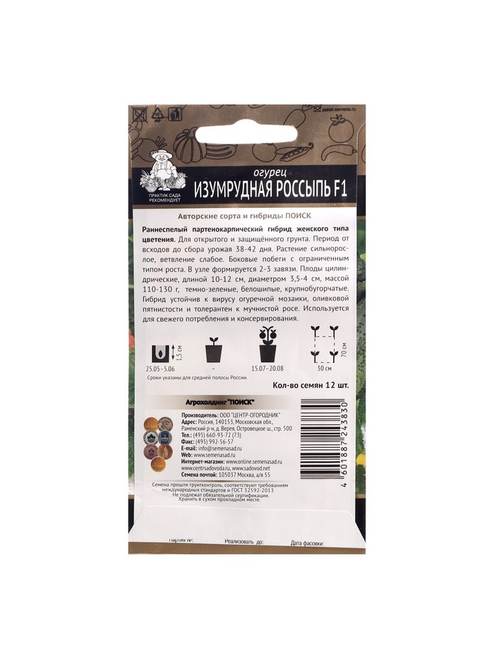 Раннеспелый партенокарпический гибрид женского типа цветения. Для открытого и защищённого грунта. Период от всходов до сбора урожая 38-42 дня. Растение сильнорослое, ветвление слабое. Боковые побеги с ограниченным типом роста. В узле формируется 2-3 завязи. Плоды цилиндрические, длиной 10-12 см, диаметром 3,5-4 см, массой 110-130 г, темно-зеленые, белошипые, крупнобугорчатые. Гибрид устойчив к вирусу огуречной мозаики, оливковой пятнистости и толерантен к мучнистой росе. Используется для свежего потребления и консервирования.
