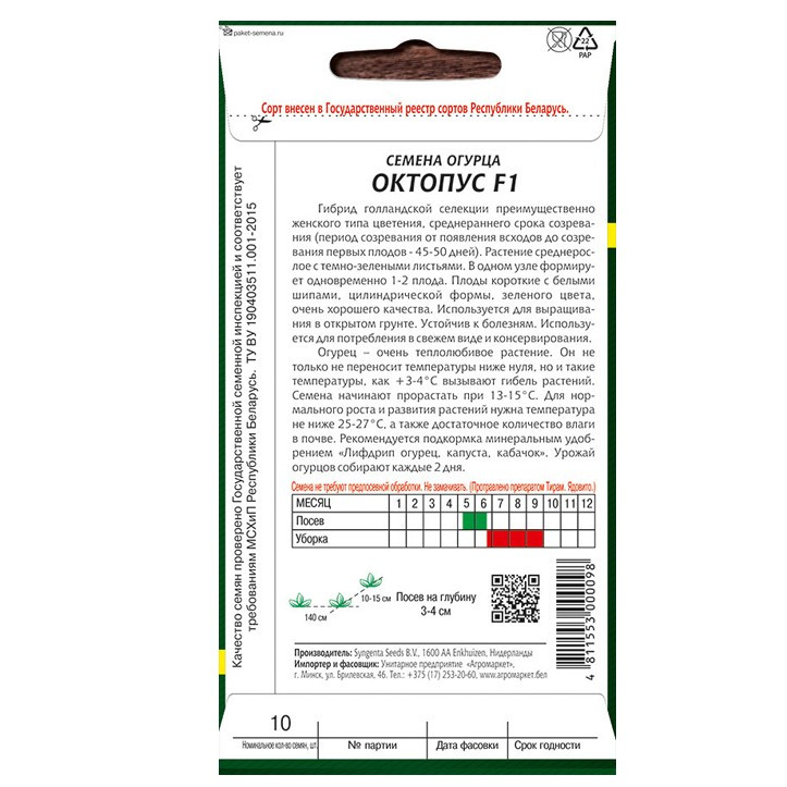 Гибрид голландской селекции преимущественно женского типа цветения, среднераннего срока созревания (период созревания от появления всходов до созревания первых плодов – 45-50 дней). Растение среднерослое с темно-зелеными листьями. В одном узле формирует одновременно 1-2 плода. Плоды короткие с белыми шипами, цилиндрической формы, зеленого цвета, очень хорошего качества. Используется для выращивания в открытом грунте. Устойчив к болезням. Используется для потребления в свежем виде и консервирования.